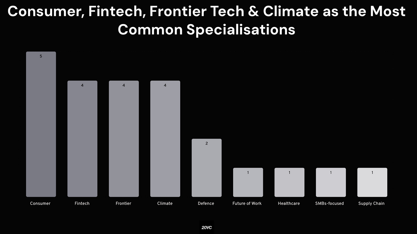 The study indicates that most European micro funds maintain a broad investment approach, with 71 percent operating as generalists and 29 percent pursuing a thematic strategy. Among specialist managers, the most common areas of focus are consumer, fintech, frontier technology and climate. Consumer leads with five dedicated funds, while fintech, frontier tech and climate each account for four.