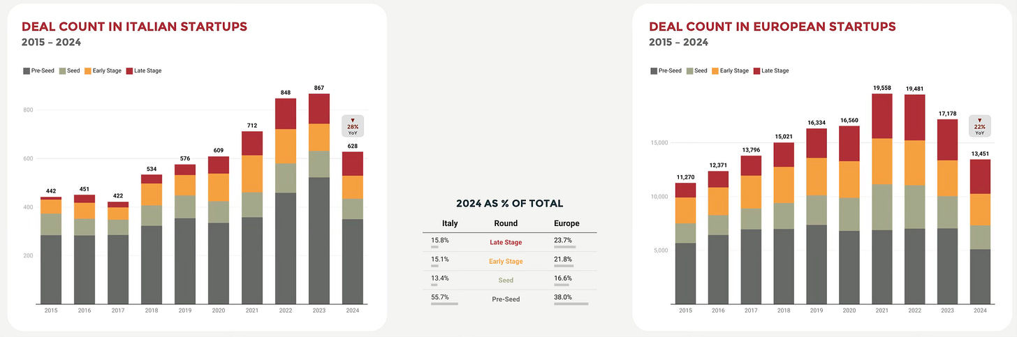 In 2024, Italy recorded 628 venture capital deals, marking a 28% drop from the 867 deals closed in 2023 and falling below 2021 levels. This decline outpaced Europe’s 22% contraction, where total deals dropped from 17,178 in 2023 to 13,451 in 2024. Despite this, Italy’s share of Europe’s total deal volume remained stable at 4.7%.