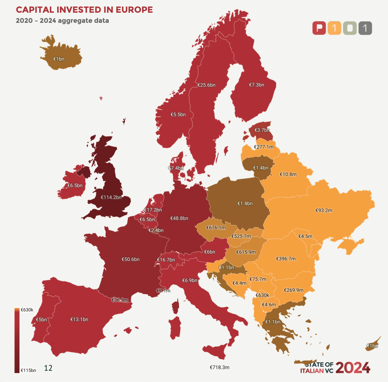 Despite being Europe’s fourth-largest economy by GDP, Italy’s VC funding remains structurally low, highlighting ongoing difficulties in scaling innovation and attracting growth-stage capital. On a per capita basis, Italy ranks only 24th in Europe, with €114 invested per person, compared to Spain at €280, Portugal at €493, Austria at €663, Estonia at €2,800, and Luxembourg at €3,800. Although the funding gap remains wide, Italy’s continued growth points to the potential for further alignment with Europe’s leading innovation ecosystems.