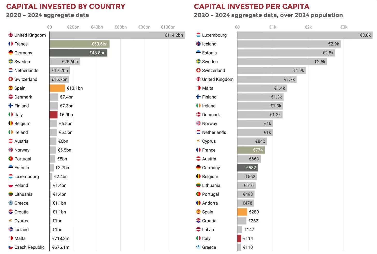 Between 2020 and 2024, Italy secured €6.9 billion in venture capital investments, ranking 10th in Europe. While ahead of Belgium with €6.5 billion and Austria with €6 billion, Italy remained well below Spain’s €13.1 billion and significantly behind leading markets such as the United Kingdom with €114.2 billion, France with €50.6 billion, and Germany with €48.8 billion.